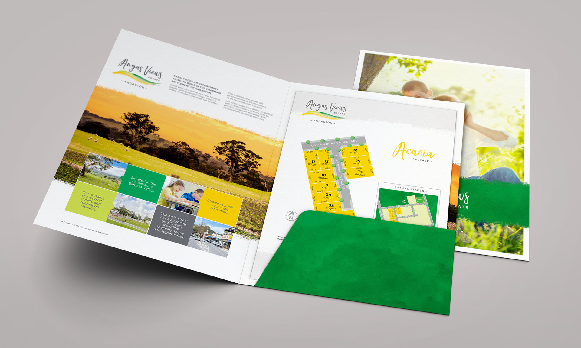 A colourful and inviting brochure folder was produced to contain documents, such as price lists, guidelines and legal documents. Other collateral included directional and site signage. Location photography in and around Angaston was also carried out to promote a country living and community lifestyle.