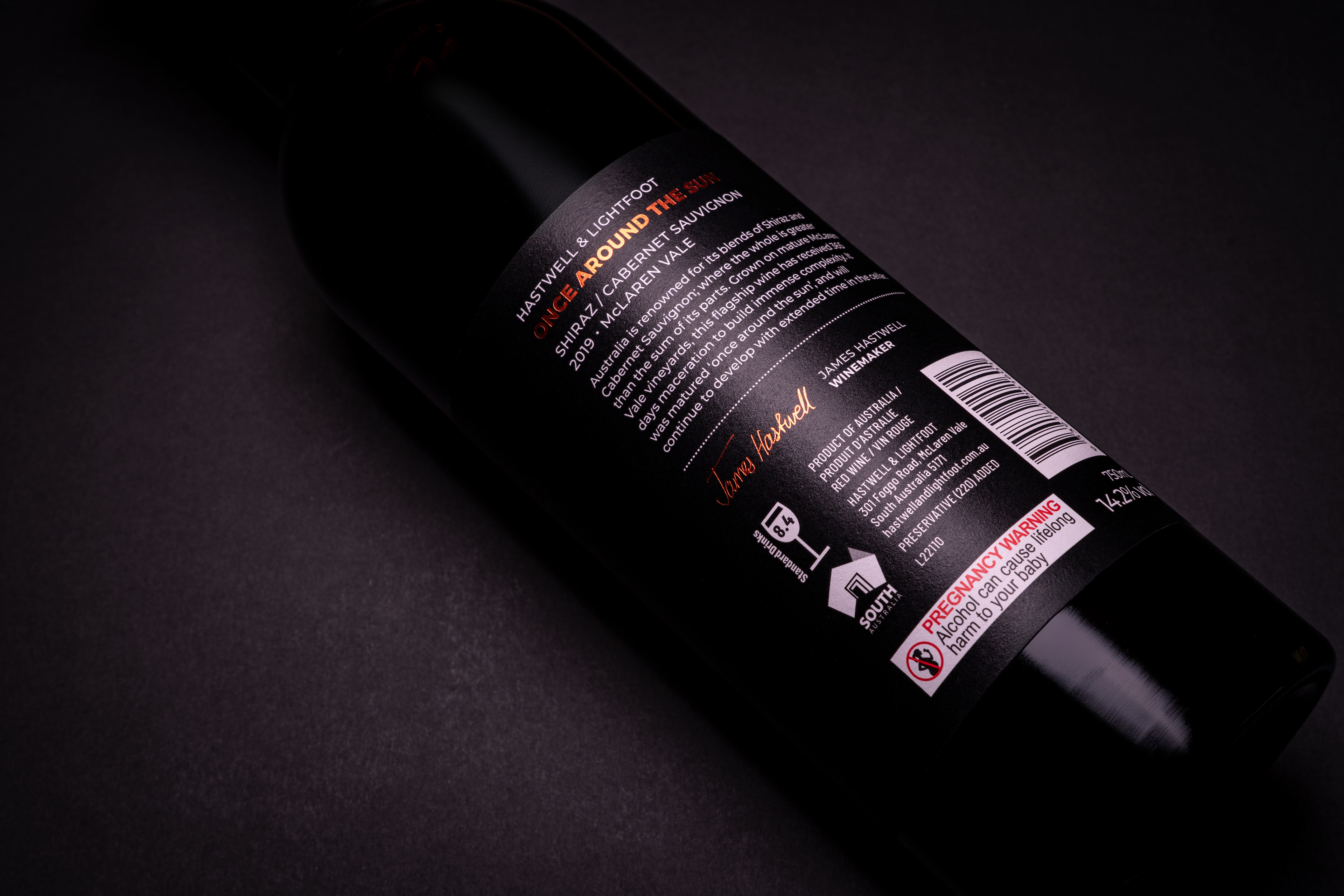 The label design for ‘Once Around the Sun’ was conceived to embody simplicity and elegance, distinguishing it as a premium offering in the Hastwell & Lightfoot range. The choice of a black label serves as a sophisticated backdrop, accentuated by copper foil highlights and high-build gloss elements that enhance the visual appeal and tactile experience.